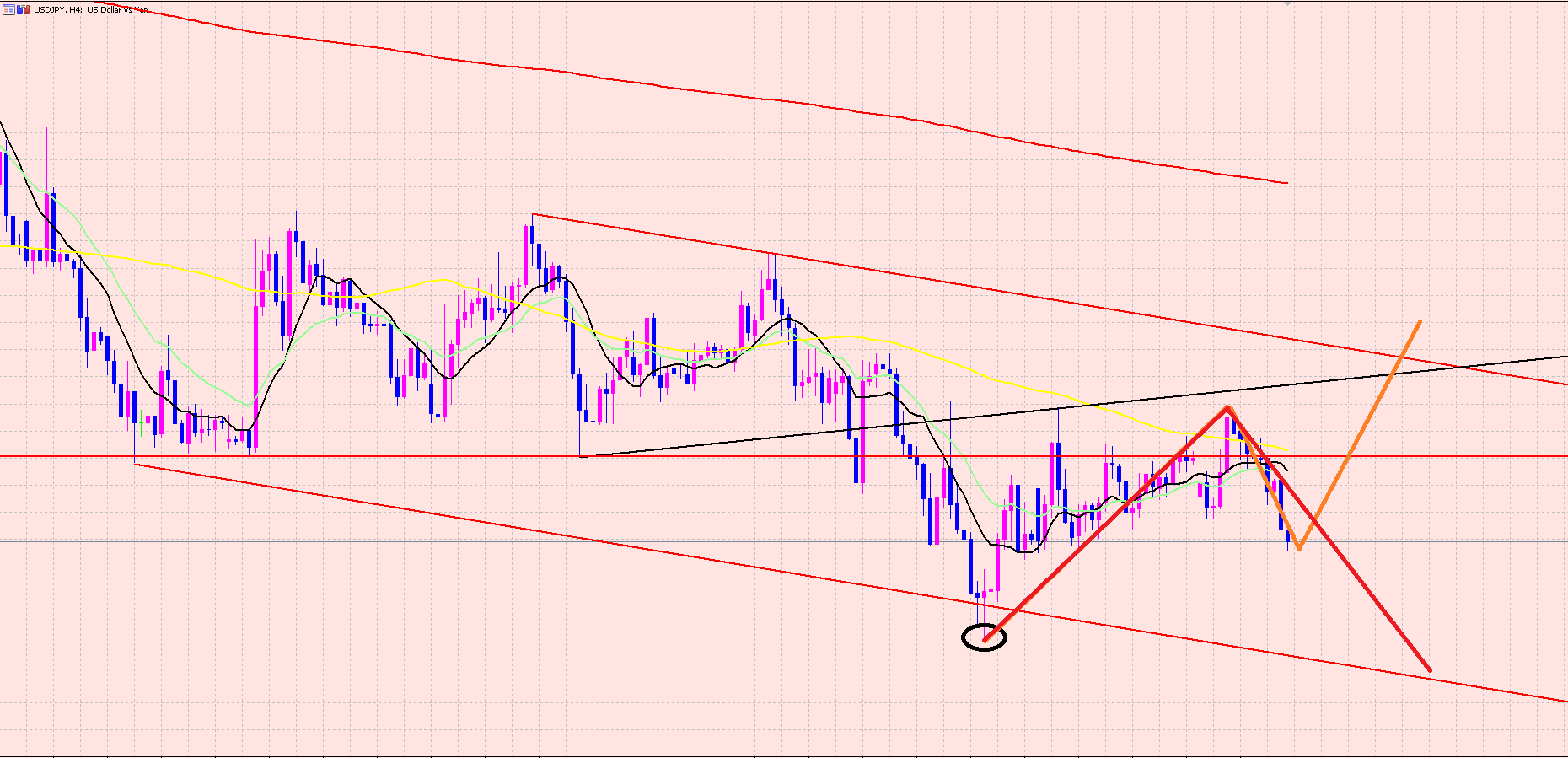 今は赤のチャネルラインの中で動いているので、次に目指すのは下値の赤のラインの下限か、ブレイクを目指していくのがサイクルで考えると普通の動きになるかな~と思っています。