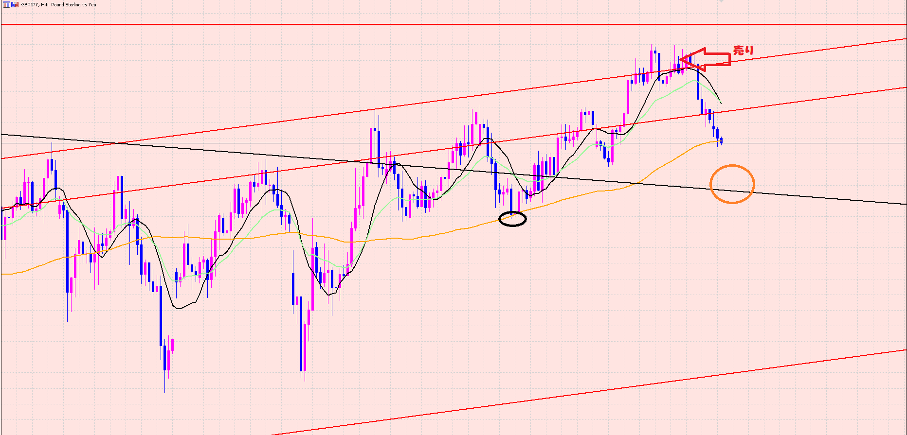 私は赤の⇦のポイントから売りエントリーで利益拡大中です(#^^#)