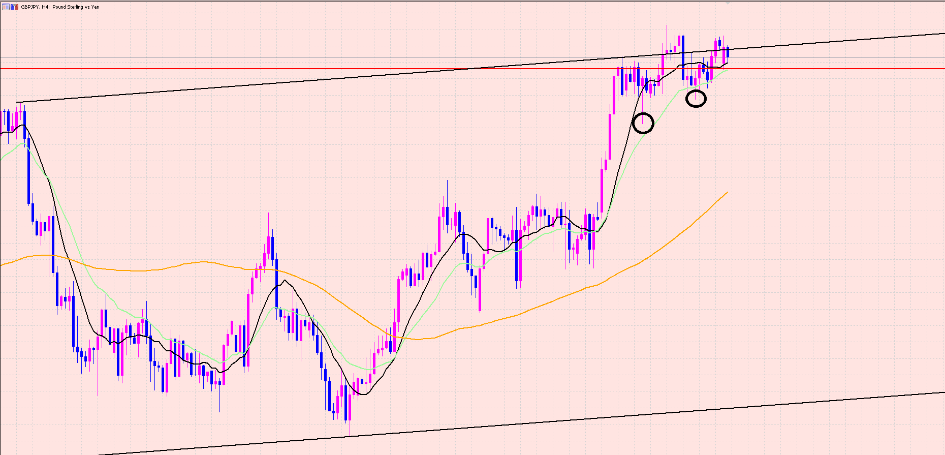ポンド円の4Hサイクルは黒○からスタートしているので今は62本目ですよぉ(^^♪