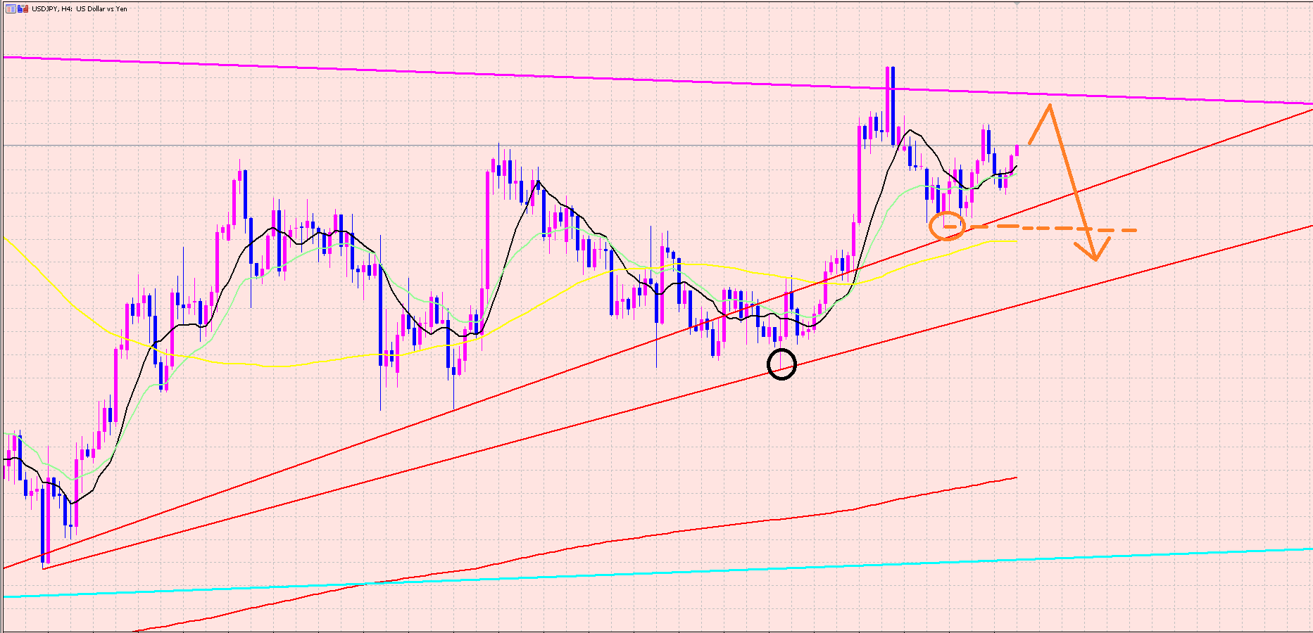 4Hサイクル天井をつけている可能性があるので、力強く上昇して高値更新しないと押し目にはなりません♪