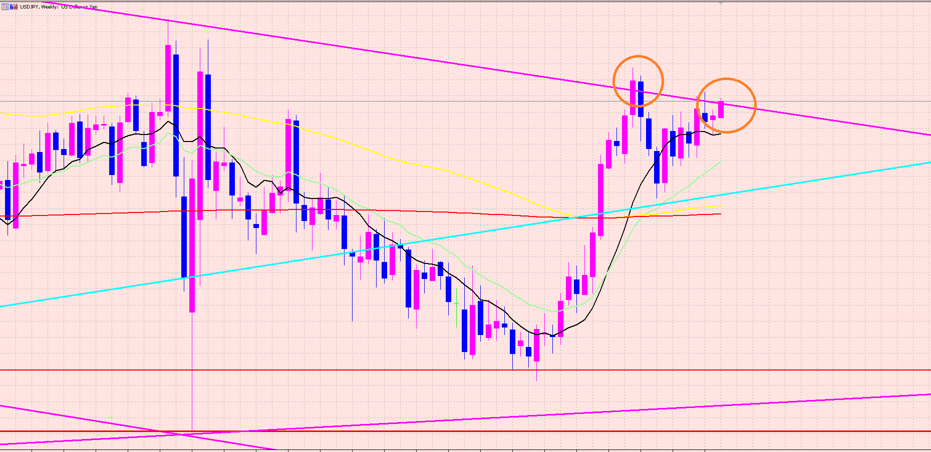 ピンクのトレンドラインは長期のダウントレンドを基準に引いています(´▽`*)