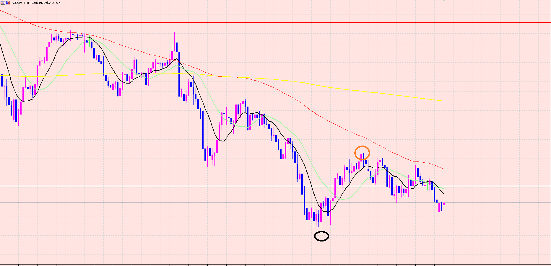 ダウントレンドということは、今回の4Hサイクルもさらに直近の安値まで更新していく可能性もありますし、