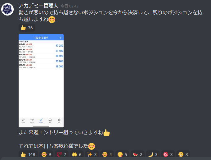私のアカデミーでは先出しでエントリーポイント・損切りライン・利益確定ポイントを事前配信します。