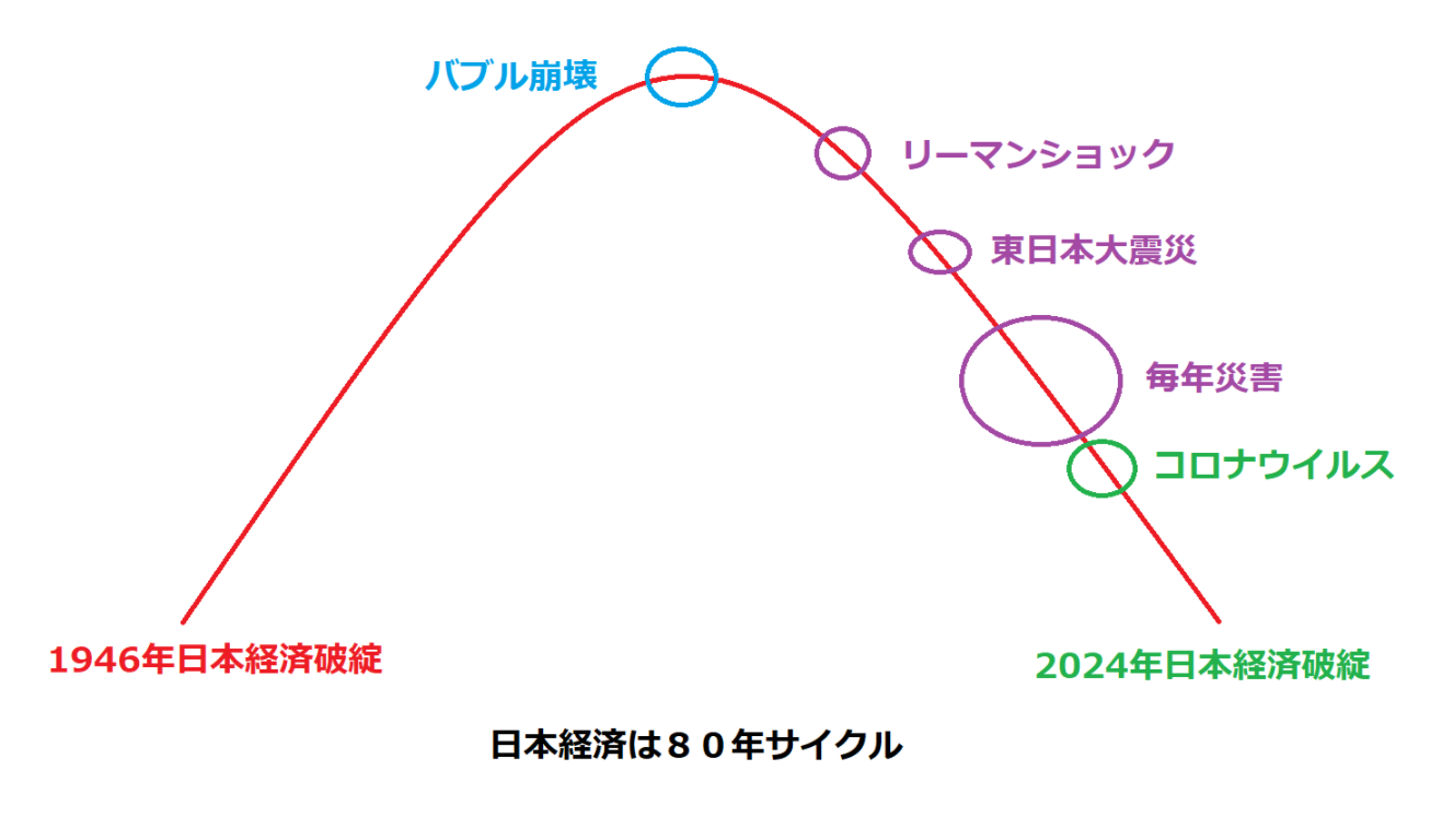 1946年に日本経済は破綻してますので、1946年にサイクルがスタートして天井がバブルになります。