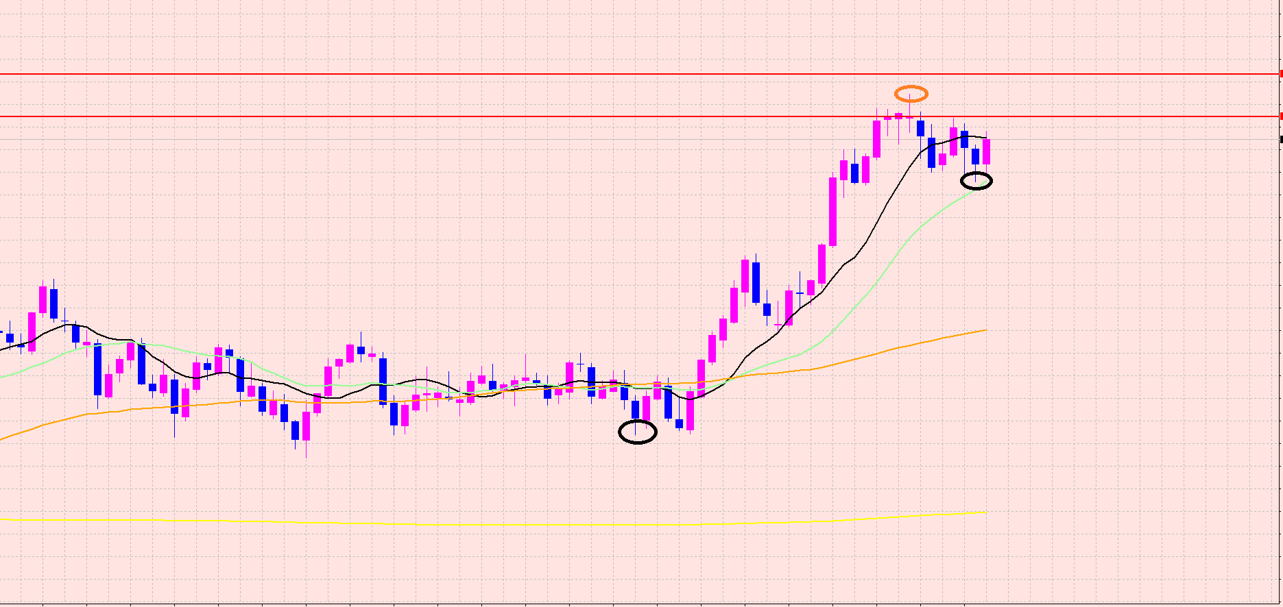 直近高値のオレンジのラインを超えずに売りサイン点灯の場合はエントリーを狙いますが、