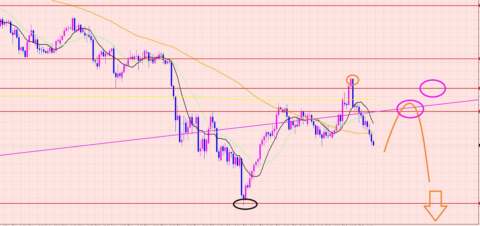 ピンクのトレンドラインに当たるピンクの〇のポイントのレジスタンスに注目していますが、