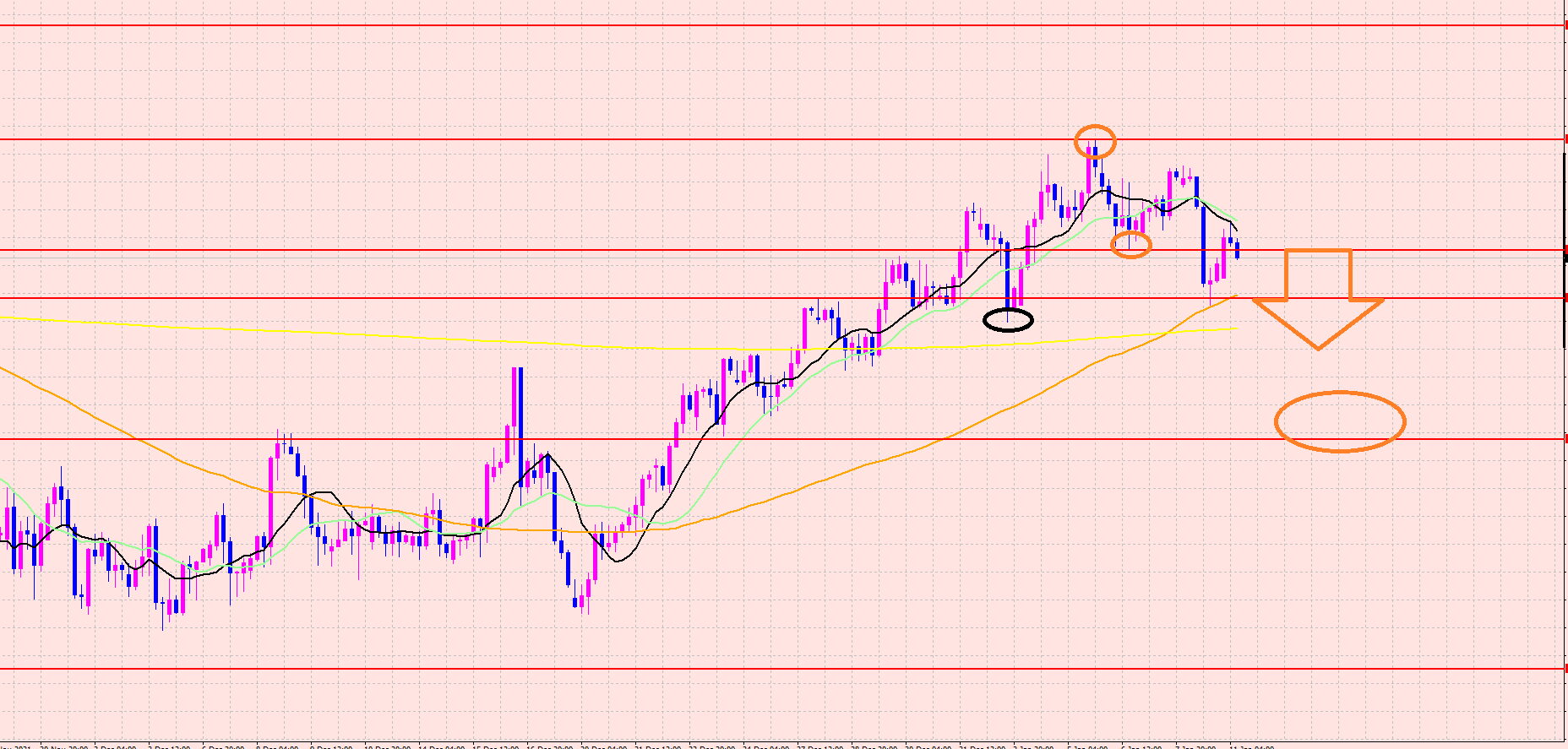 注目していた、上下のオレンジの〇のポイントは下ブレイクしましたね♪