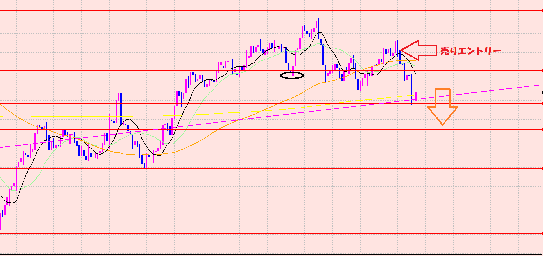 私は赤の⇦のポイントから売りエントリーしましたよぉ♡