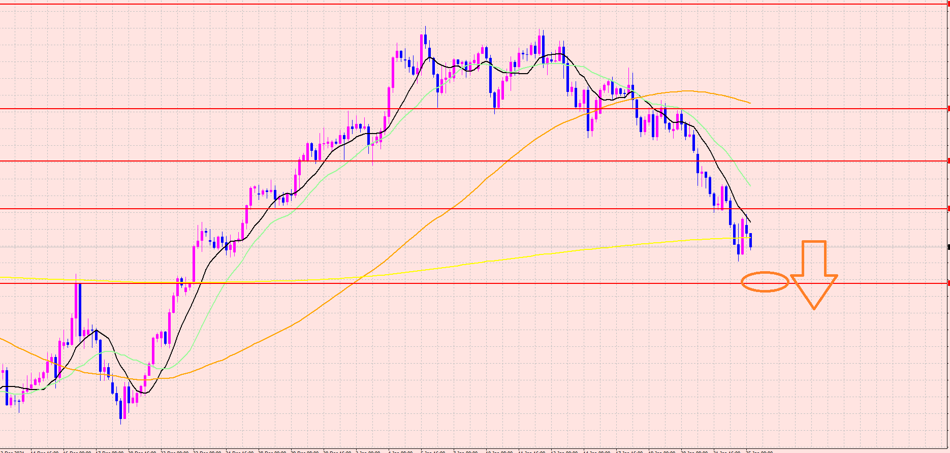 次のラインをブレイクすれば、黄色の移動平均線、そしてまた次のラインがサポートされる可能性が高くなります。
