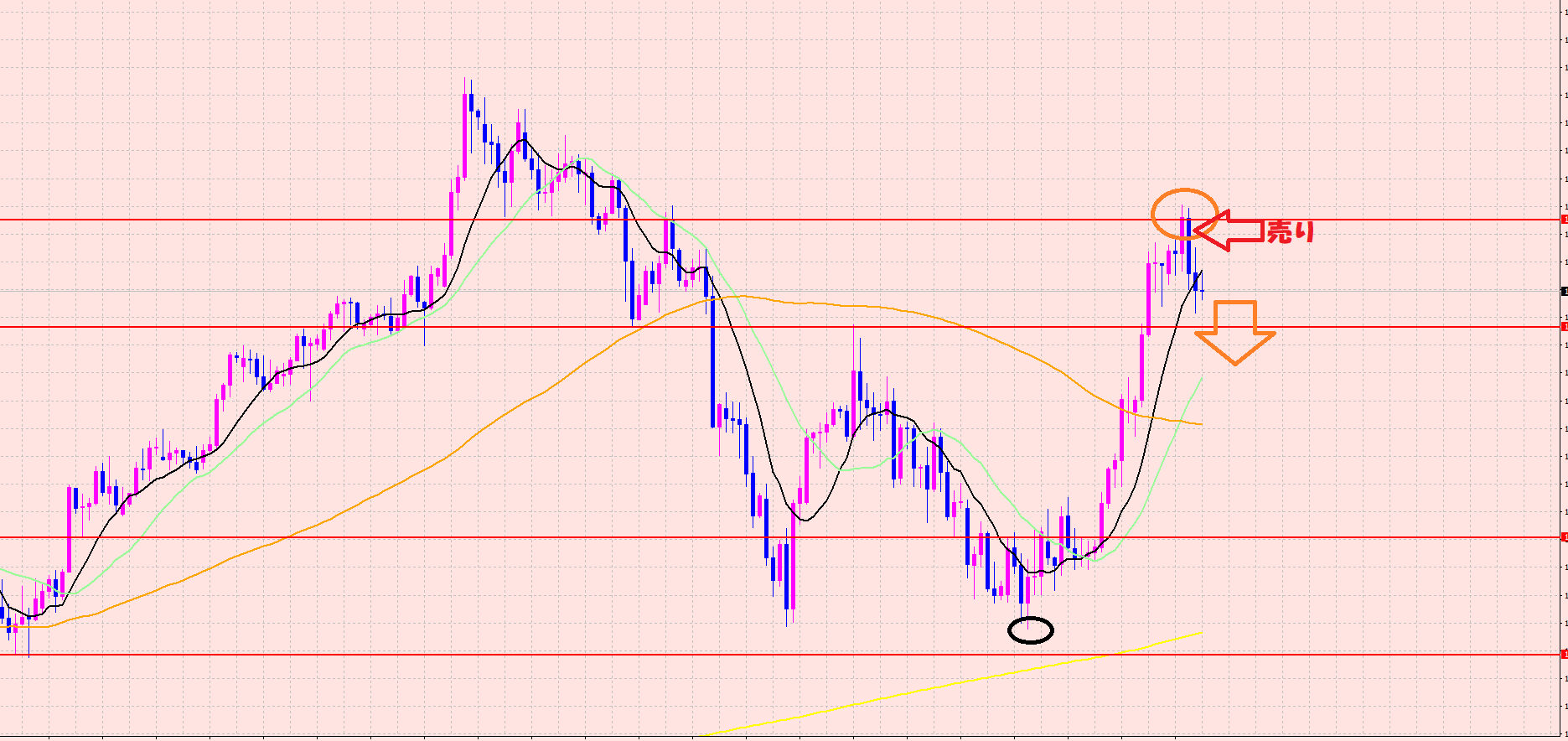 一旦オレンジの移動平均線辺りをブレイクしたのでダウントレンドは崩れましたね♪