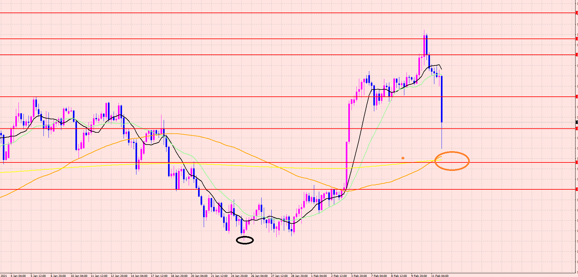 下値に黄色の移動平均線とオレンジの移動平均線があるので、この辺りは特にポイントになりそうです♪
