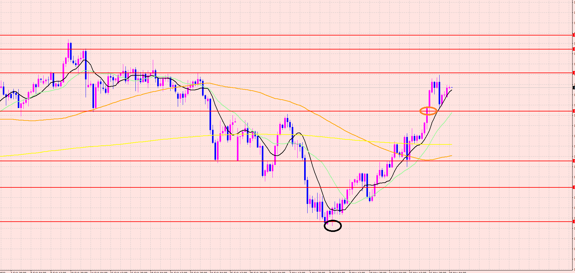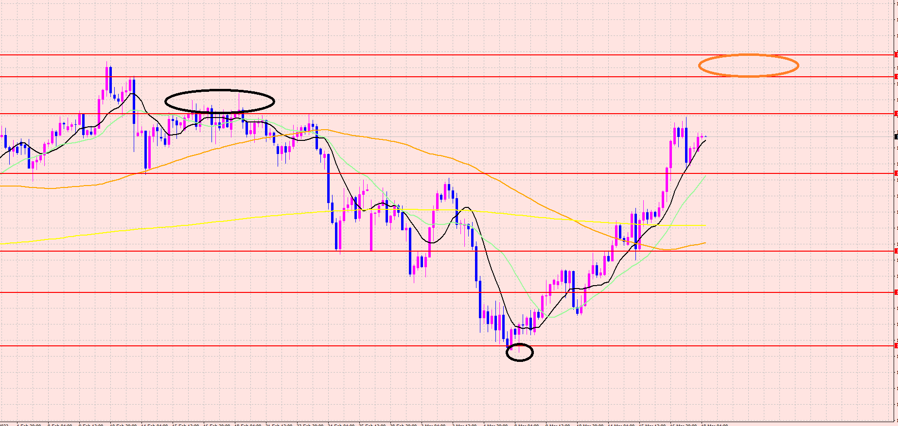 ですが、実体でブレイクしていくような場合は、特に次のオレンジの〇のラインまでの上昇をしてから下落に入る可能性があるので注目していきますね♡