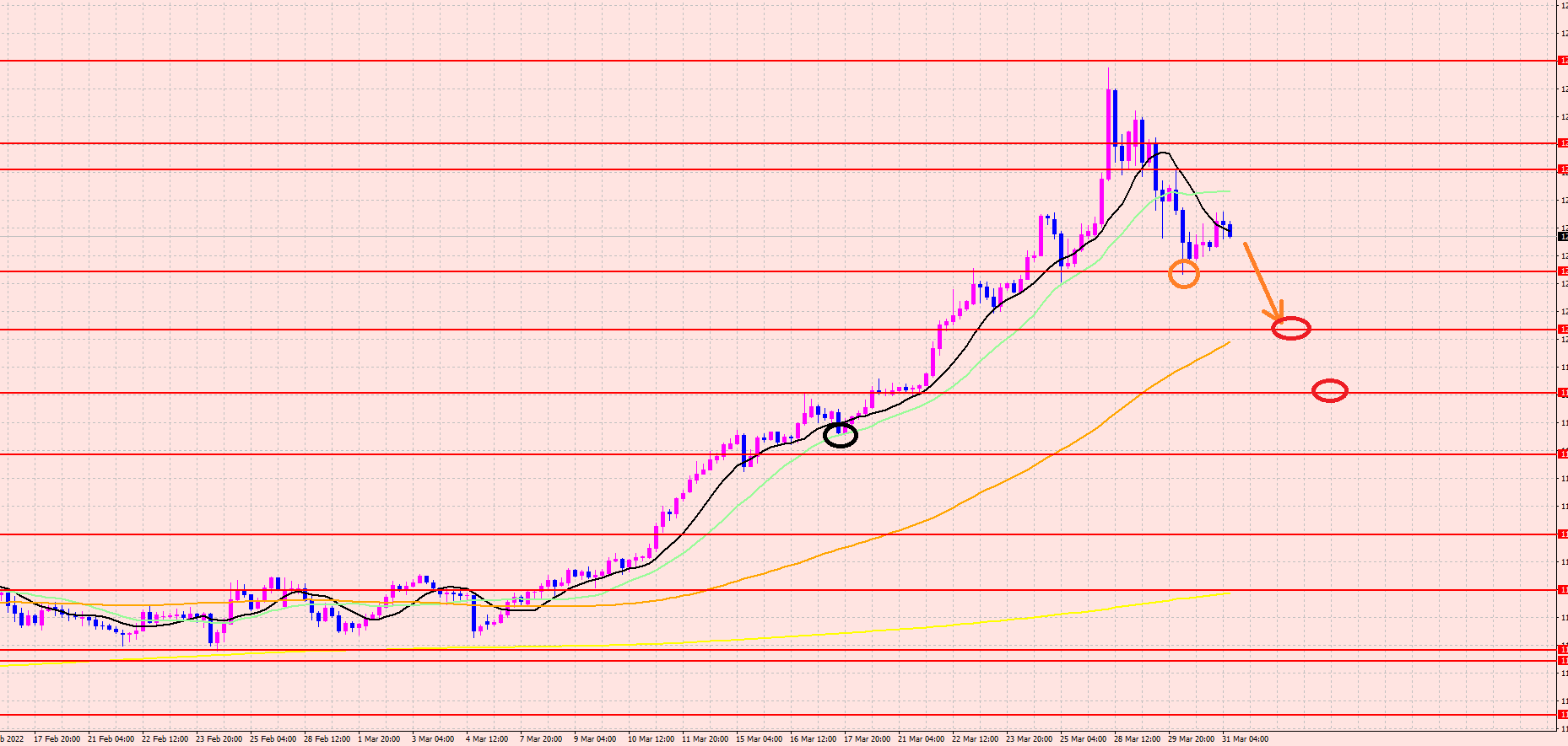 下値にオレンジの移動平均線もあるので、黒○の安値までの間のオレンジの移動平均線と2本のラインには特に注目していこうと思います♡