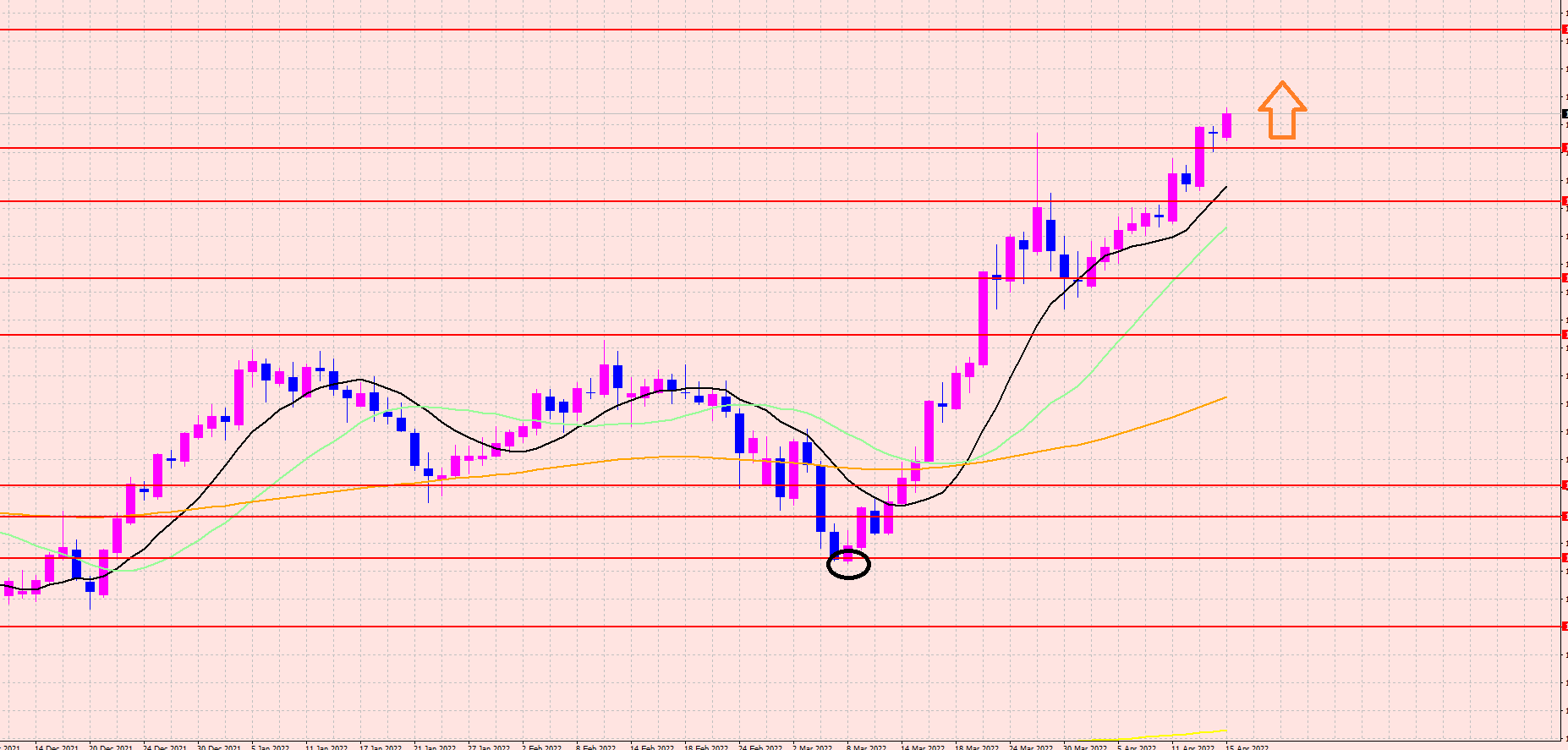 その中でも高値更新しているので、今はオレンジの〇からスタートしている可能性があります。
