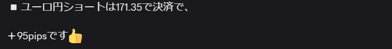 チャートから分かるように既にボトムの時間帯に入っているのでサロン配信ショートは欲張らずに利確しました。