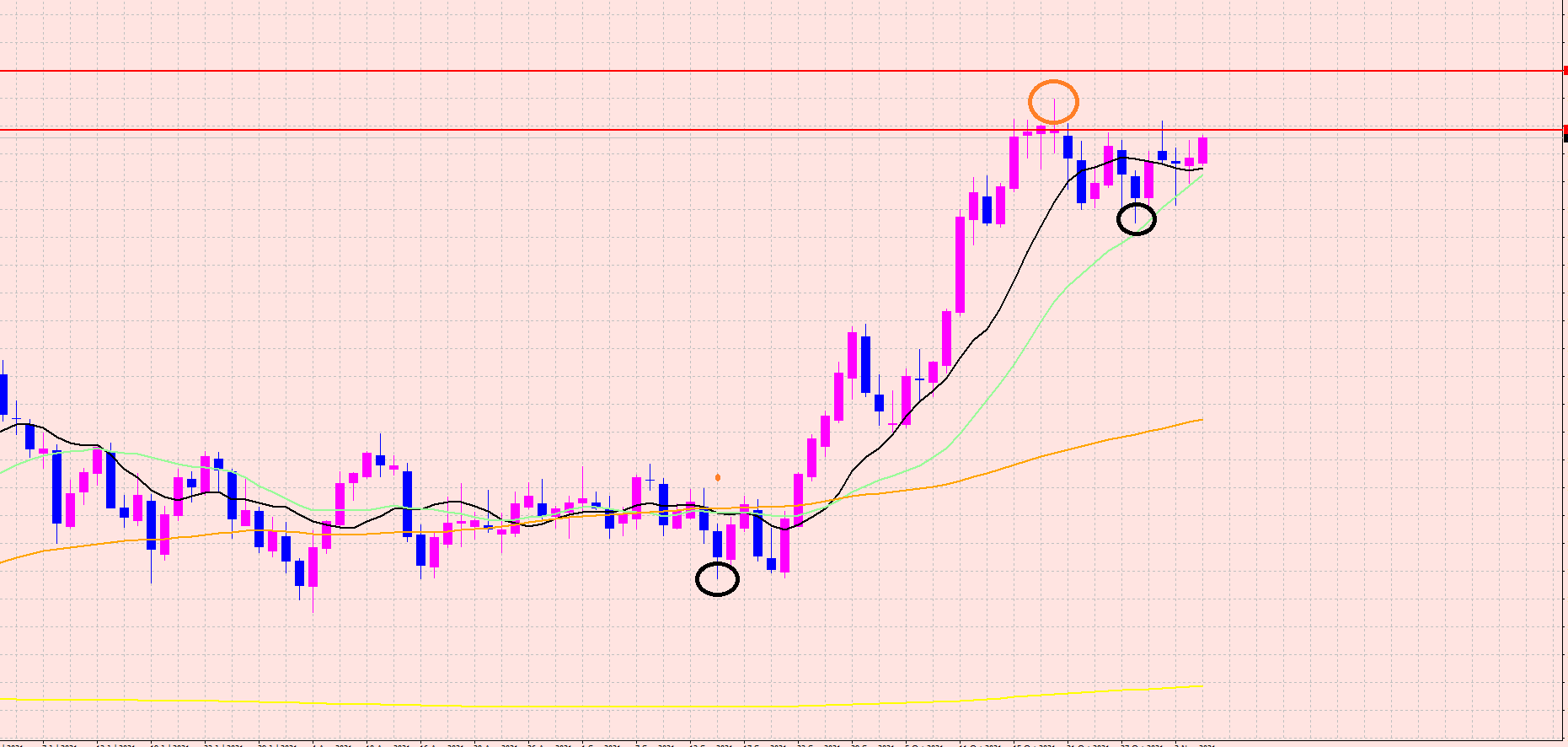 直近高値のオレンジのラインを超えてしまうと、